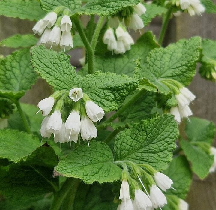 This lovely white comfrey is prolific in East Anglia and smaller than the more common purple flowered one. Its leaves are great