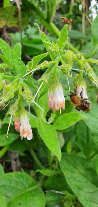 Common prickly comfrey is trumpeting its last flowers and the bees working hard as they fade.